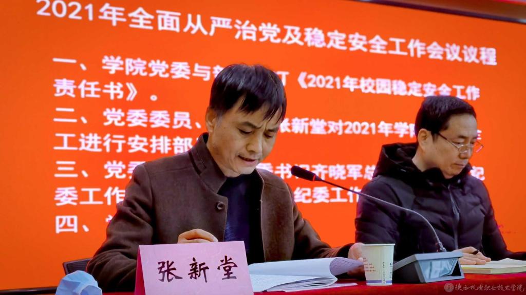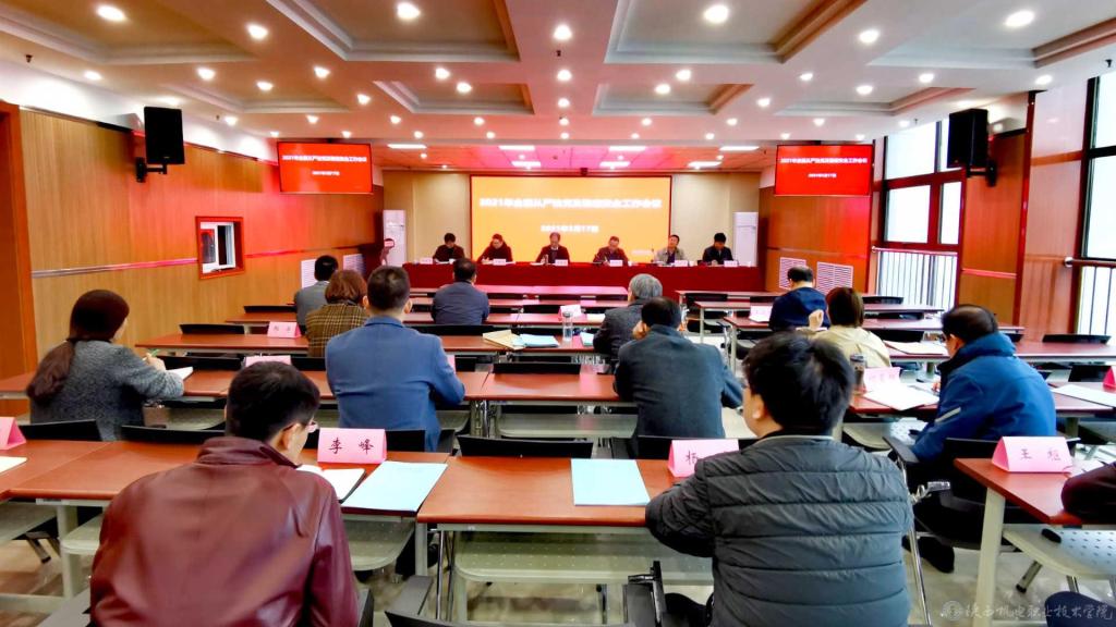 陕西机电职业技术学院2021年全面从严治党及稳定安全工作会议于3月17日上午在宝福路校区视频会议室召开,党委书记伊逊智,院长向纪明,党委副书记邓新治,党委副书记、纪委书记齐晓军,副院长张新堂,院长助理赵争东出席会议。会议由向纪明主持,学院各部门负责人参加会议。