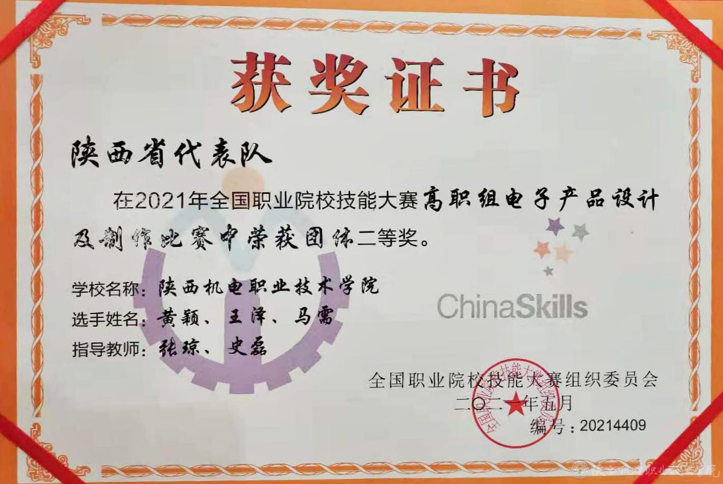 2021年6月20日,2021年“全国职业院校技能大赛(高职组)——电子产品设计及制作”赛项在烟台职业学院落下帷幕,来自全国各省市的27支代表队参与了该赛项。由我校电子与信息学院张琼、史磊两位老师指导的学生黄颖、马需、王泽组队代表陕西省参赛。三名选手在比赛表现出了扎实的专业技能水平,实现了赛题规定的各项功能。经过8个小时的角逐,最终获得该赛项国家二等奖的好成绩。