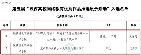 在“陕西高校网络教育优秀作品推选展示活动”遴选中,由齐晓红、李鹏老师创作的《“学四史 守初心 践使命”之党史英雄篇——赵一曼:甘将热血沃中华》、陈欢老师创作的作品《党的领导是社会主义法治的根本保证》获优秀微课作品组优秀奖。