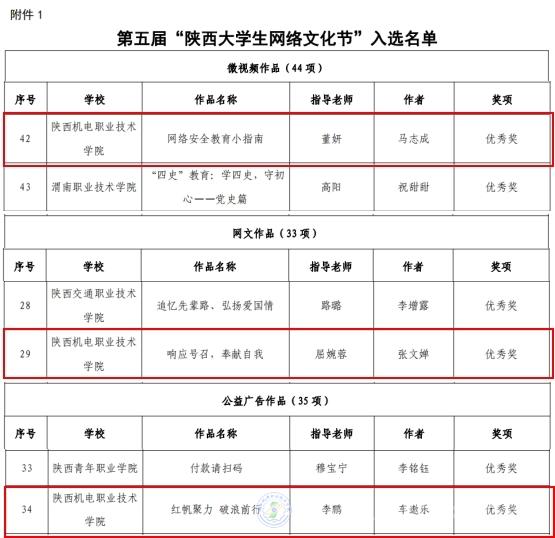 由董妍老师指导,马志成同学创作的作品《网络安全教育小指南》获微视频组优秀奖;由屈婉蓉老师指导,张文婵同学创作的作品《响应号召,奉献自我》获网文组优秀奖;由李鹏老师指导,车遨乐同学创作的作品《红帆聚力 破浪前行》获公益广告组优秀奖。