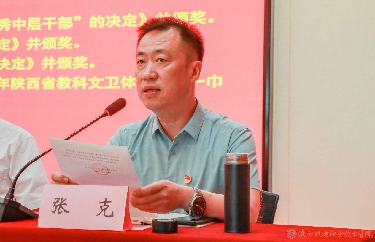 院长助理赵争东宣读陕西省教科文卫体工会《关于表彰2022年陕西省教科文卫体系统五一巾帼标兵和标兵岗的通报》并为五一巾帼标兵电子与信息学院副教授张琼和五一巾帼标兵岗智能制造学院机电系颁奖。