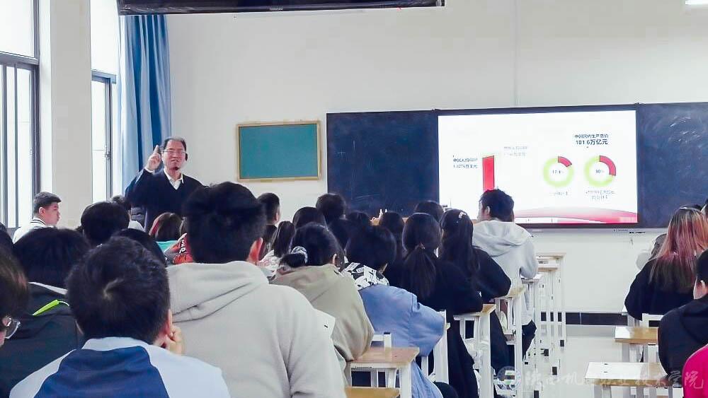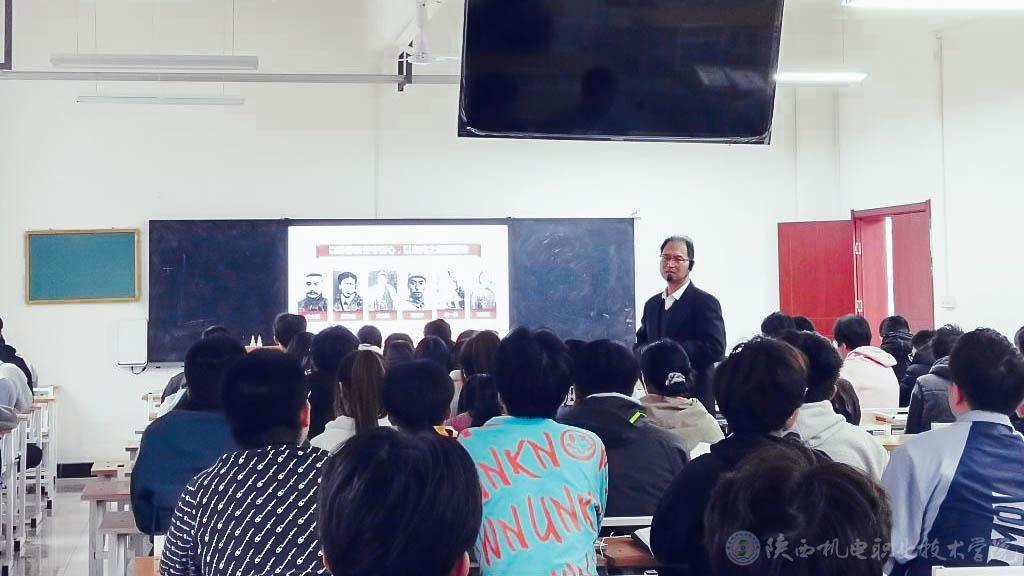 11月7日下午7、8节课,陕西机电职业技术学院党委书记伊逊智在博学楼413教室为22铁道信号2班和22铁道运管1班学生上形势与政策课,讲授《新时代全面从严治党的伟大实践》和《伟大时代的历史跨越》专题内容。