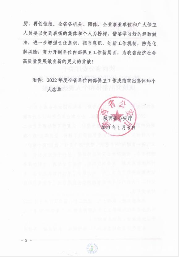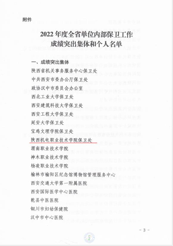近日,陕西省公安厅发布了《陕西省公安厅关于对2022年度全省单位内部治安保卫工作成绩突出集体和个人表扬的通报》,我校保卫处喜获“全省单位内部治安保卫工作成绩突出集体”荣誉称号,同时获得宝鸡市公安局金台区“2022年度治安重点单位先进集体”,保卫处副处长常小凯同志被评为“2022年度金台区治安重点单位保卫工作先进个人”。