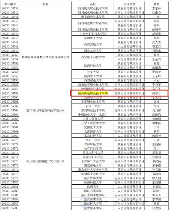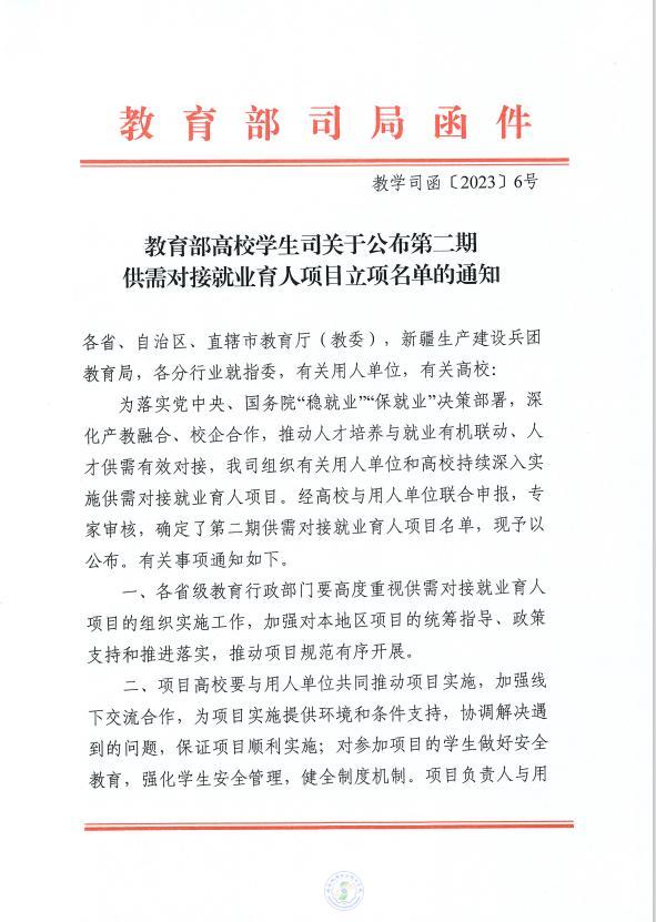 4月6日,教育部高校学生司印发了《关于公布第二期供需对接就业育人项目立项名单的通知》(教学司函〔2023〕6号)。其中,我校与浙江吉利控股集团有限公司、杭州海康威视数字技术股份有限公司、广联达科技股份有限公司等3家企业的定向人才培养培训项目获批。这是我校首次参加并获批教育部供需对接就业育人项目,也是我校高度重视产教融合、校企合作的重要成果。
