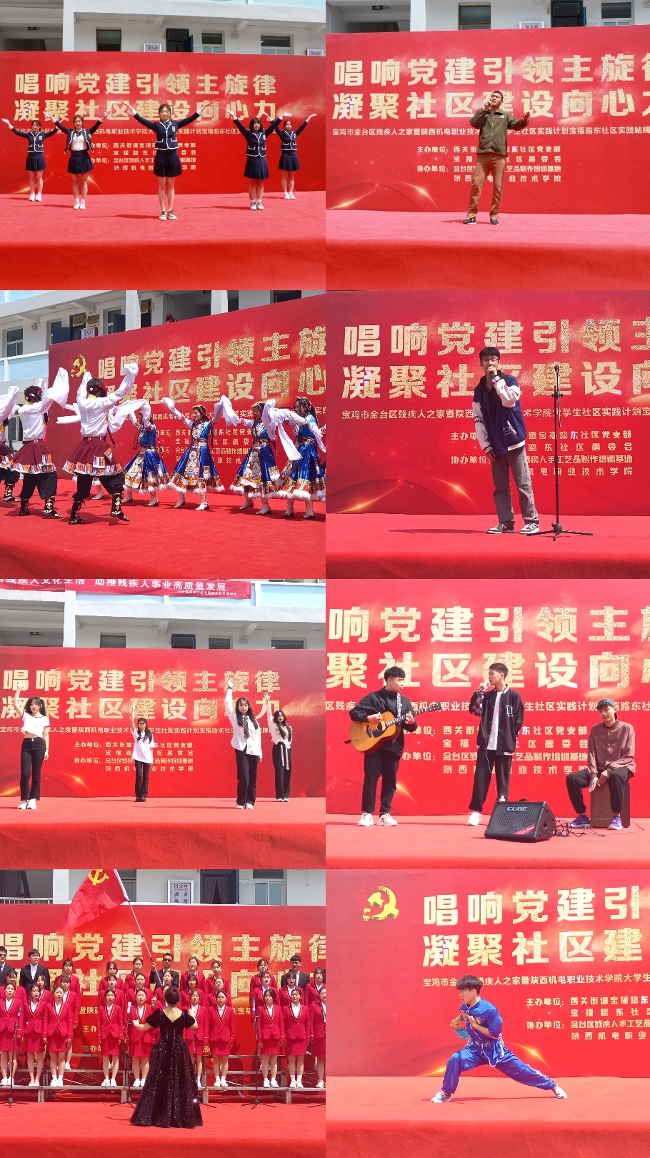 仪式上,王世鹏、张丽华、杨鹏、孟发军、赵兰、巨峰共同为陕西机电职业技术学院大学生社区实践计划宝福路东社区实践站揭牌。随后,我校大学生带来了形式多样、丰富多彩的文艺汇演。歌曲《唱支山歌给党听》、《至少还有你》、舞蹈《yes OK》、《锅庄舞》、《相亲相爱》、武术表演、吉他演奏等节目展现了我校青年大学生朝气蓬勃、锐意进取、充满激情的精神面貌。文艺汇演表演形式新颖,内容丰富,处处洋溢着青春的活力。现场气氛热烈、高潮迭起,精彩的演出和忘我的投入赢得了全场一次次热烈的掌声。