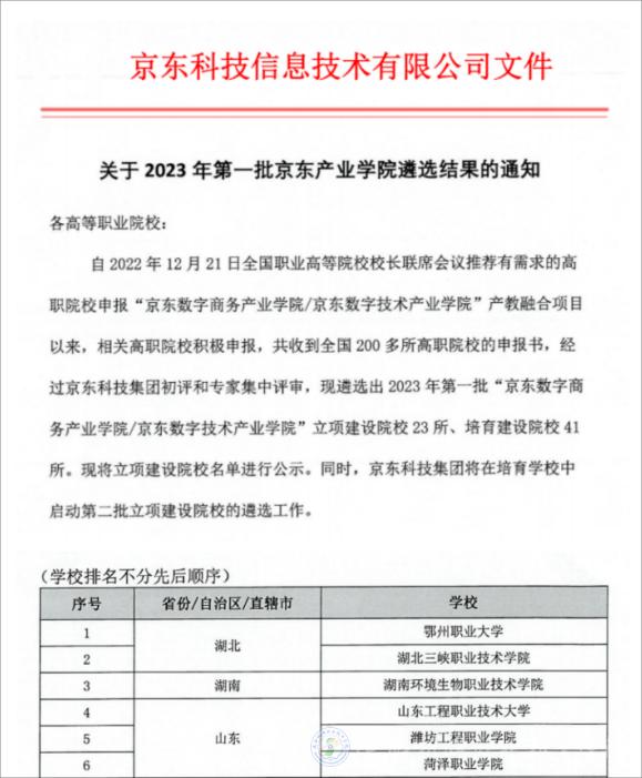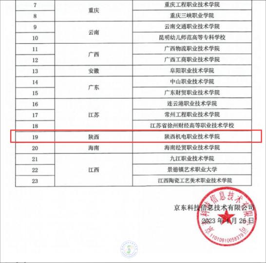 2023年5月4日,京东集团发布《关于2023年第一批京东产业学院遴选结果的通知》,公布了立项建设院校23所,陕西机电职业技术学院从参与的200多所高职院校中脱颖而出,成为陕西省唯一入选院校。