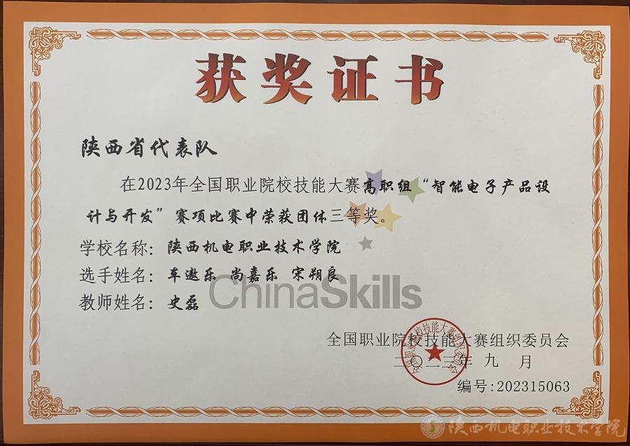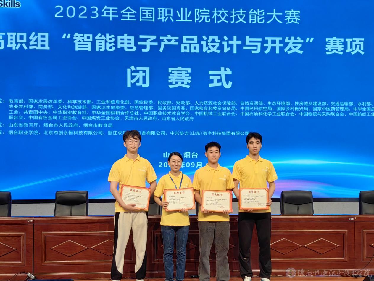 9月26—27日,2023年全国职业院校技能大赛高职组“智能电子产品设计与开发”赛项在山东烟台举行。我校电子与信息学院教师史磊与车遨乐、尚嘉乐、宋朔良三位同学组成的竞赛队代表陕西省,与来自全国31个省市区的59支参赛代表队同台竞技,经过2天激烈的角逐,荣获团体三等奖。