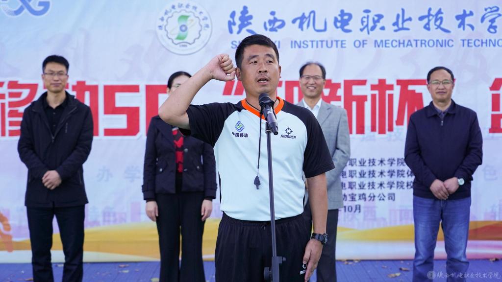体育部教师姚康华、23机电一体化2班学生穆再排尔·芒力科分别代表全体裁判员、运动员宣誓,确保比赛公平、公正。