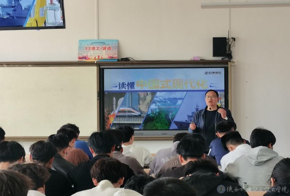 4月8日下午,陕西机电职业技术学院党委副书记、院长向纪明在博学楼418教室为22铁道工程专业学生上形势与政策课,讲授《读懂中国式现代化》专题内容。