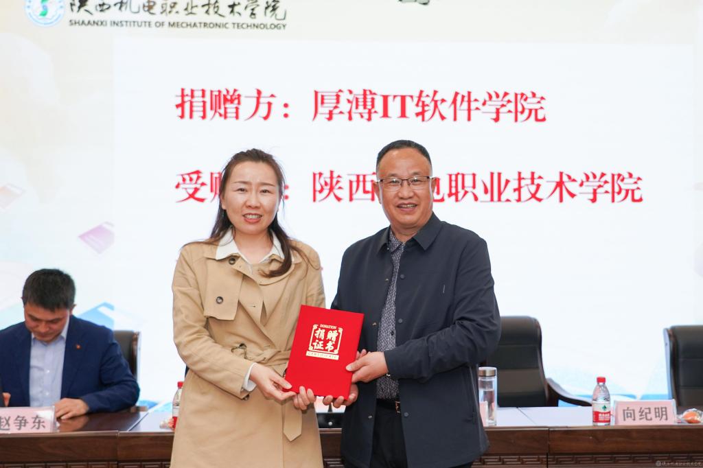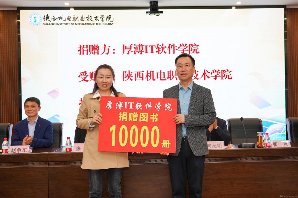 厚溥陕西公司总经理叶静代表厚溥IT软件学院向我校图书馆捐赠了图书共计10000册,为学校的阅读推广活动注入了新的活力。张克副院长代表学校接受捐赠,向纪明院长代表学校向厚溥IT软件学院颁发了捐赠证书。伊逊智书记代表学校发表了热情洋溢的感谢辞。他提到,厚溥的图书捐赠不仅是对我校教育事业的关爱和支持,更是对学校发展的信任和期待,同时,伊书记也向全校师生发出倡议,希望大家能够珍惜这份宝贵的图书资源,认真阅读、深入思考、勇于创新,不断提高自己的综合素质和能力水平。