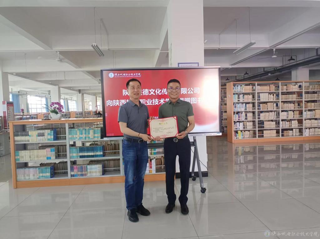 5月23日下午,在我校蟠龙校区图书馆二楼阅览厅举行了图书捐赠仪式,陕西昱徳文化传播有限公司为我校图书馆捐赠了价值两万余元的494册图书,学校党委委员、副院长张克,教务处处长白娟娟,图书馆副馆长徐建,陕西昱徳文化传播有限公司总经理于建军出席此次捐赠仪式。