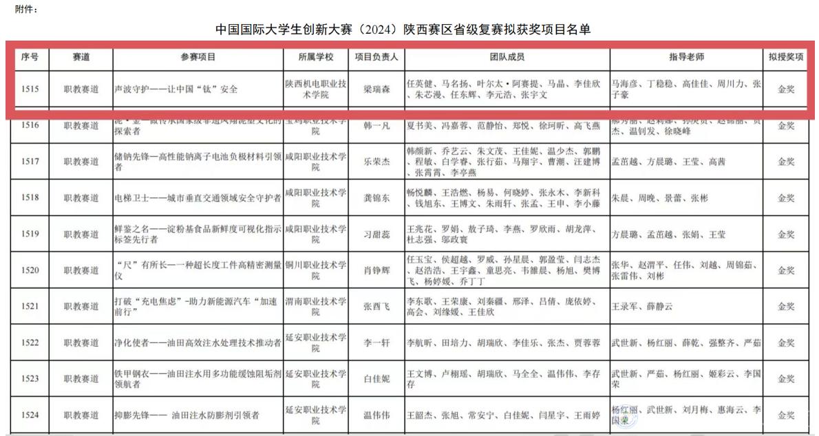 近日,陕西省教育厅对中国国际大学生创新大赛(2024)陕西赛区省级复赛拟获奖项目进行了公示,陕西机电职业技术学院团队凭借项目“声波守护——让中国钛安全”获得职教赛道金奖,实现了我校在此项赛事中的历史性突破。