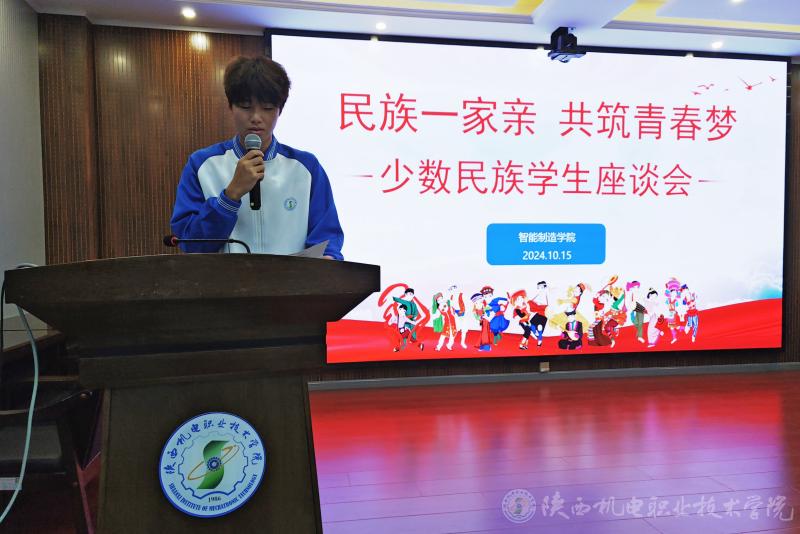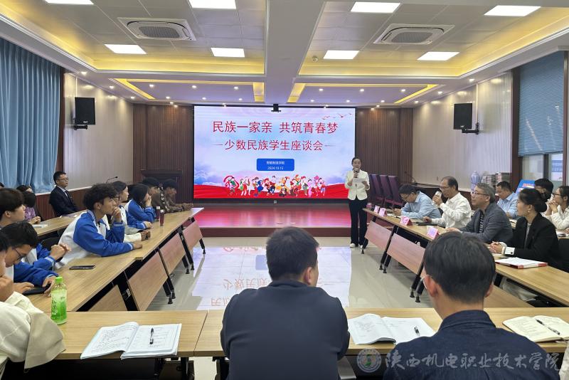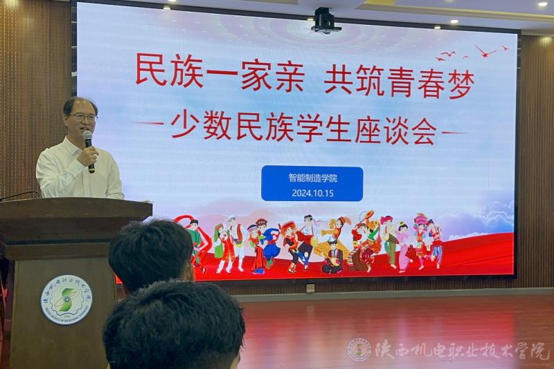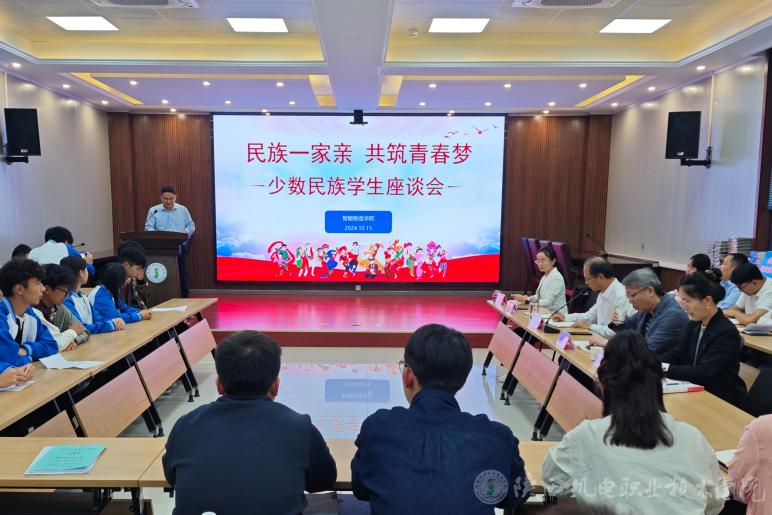10月15日下午,陕西机电职业技术学院在博学楼111会议室举办“民族一家亲 共筑青春梦”少数民族学生座谈会。校党委书记伊逊智、学生处处长王建斌、少数民族专职辅导员沙亚·革命、智能制造学院全体教职工、智能制造学院24级全体少数民族学生及23级部分学生代表参会,本次会议由智能制造学院党支部书记薛媛丽主持。