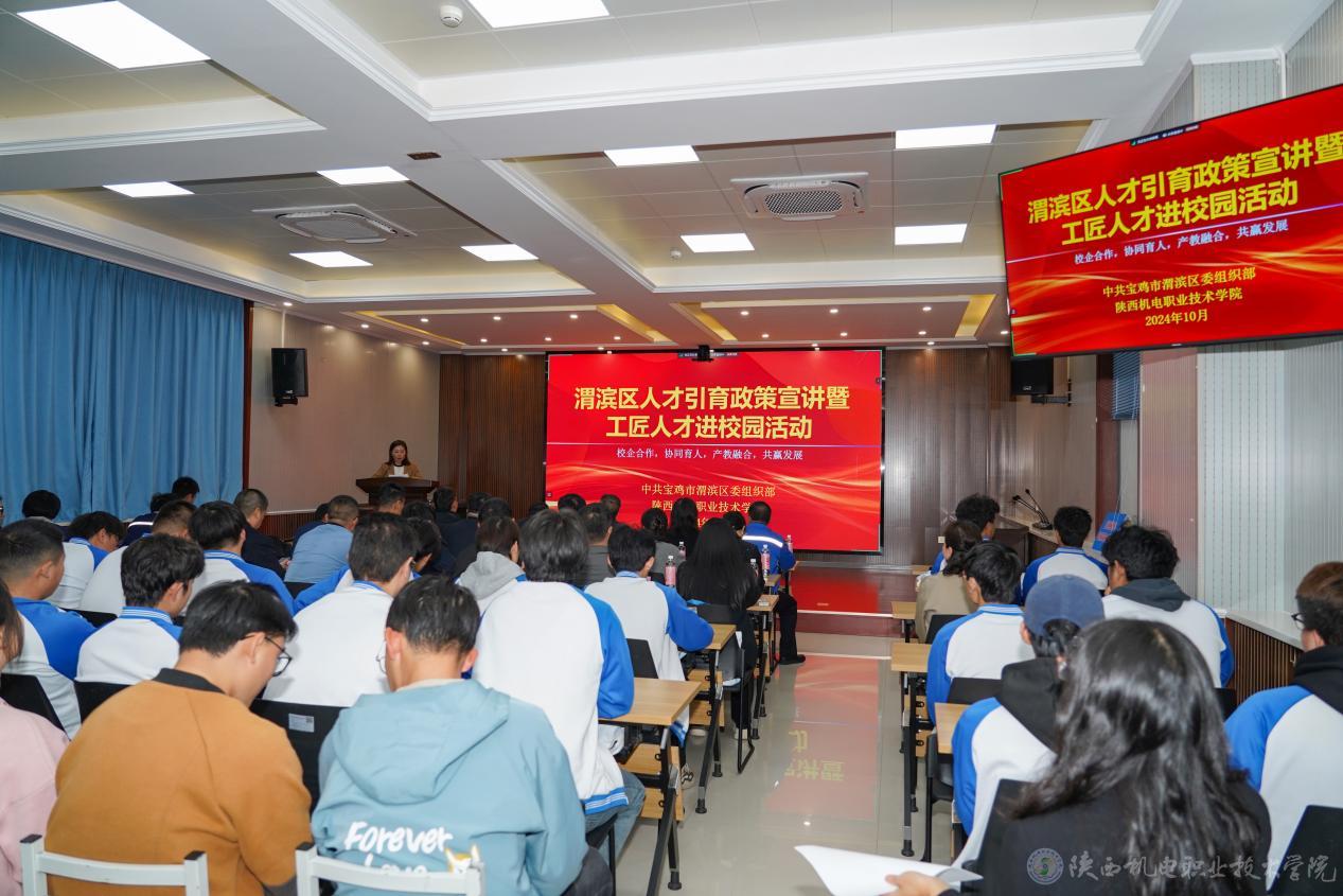 为加大人才政策宣传力度,推进人才服务走深走实,营造尊重人才、爱惜人才的良好氛围,10月28日,陕西机电职业技术学院联合渭滨区委组织部开展人才引育政策宣讲暨工匠人才进校园活动。中共渭滨区委常委、组织部长李鹏和学校党委副书记、院长向纪明等出席会议,会议由校企合作处处长白娟娟主持。
