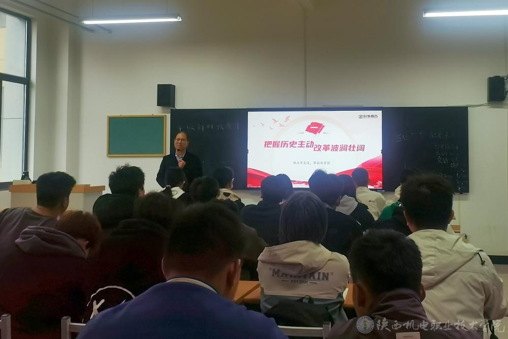 11月11日下午,陕西机电职业技术学院党委书记伊逊智在博学楼218教室为24现场工程师、24电子信息1、2合班学生上形势与政策课,讲授《改革的实践续篇,现代化的时代新篇》专题内容。