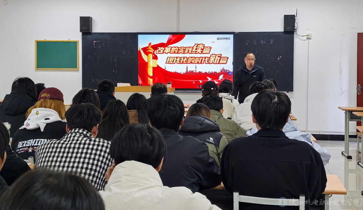 11月20日下午,陕西机电职业技术学院党委副书记、院长向纪明在博学楼112教室为23网络技术1、2合班学生上形势与政策课,讲授《改革的实践续篇 现代化的时代新篇》专题内容。