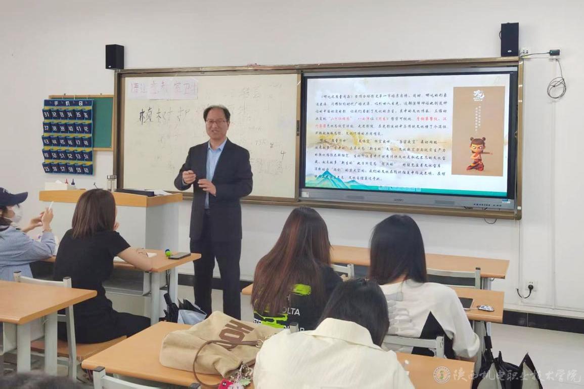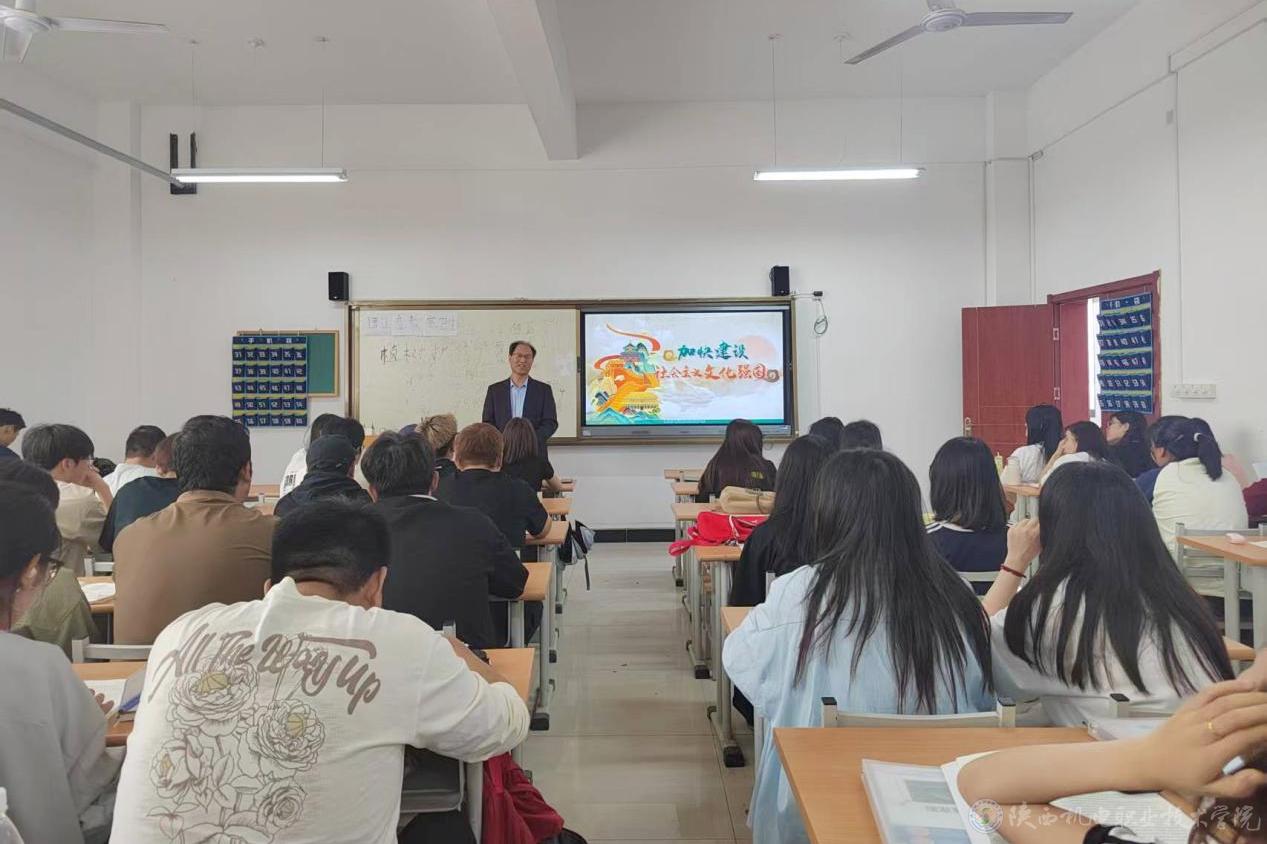 4月14日下午,陕西机电职业技术学院党委书记伊逊智在博学楼415教室为23铁道运管1、2合班80余名学生讲授形势与政策课《加快建设社会主义文化强国》专题内容。