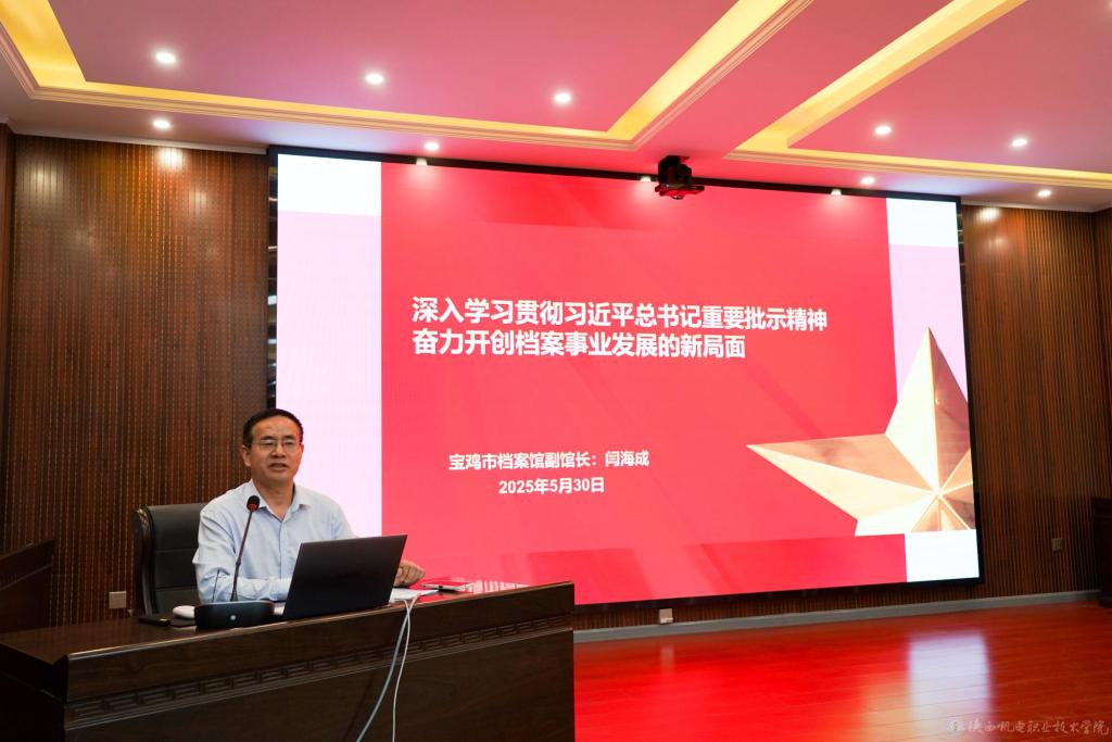 闫海成在讲话中介绍了近年来宝鸡市档案馆的创新发展成果,校地双方未来在资源共享、人才培养、文化宣传等领域深度合作。他在题为《深入学习贯彻习近平总书记重要批示精神 奋力开创档案事业发展的新局面》的主题报告中,从理论到实践系统阐释了新时代档案工作的使命与方向。
