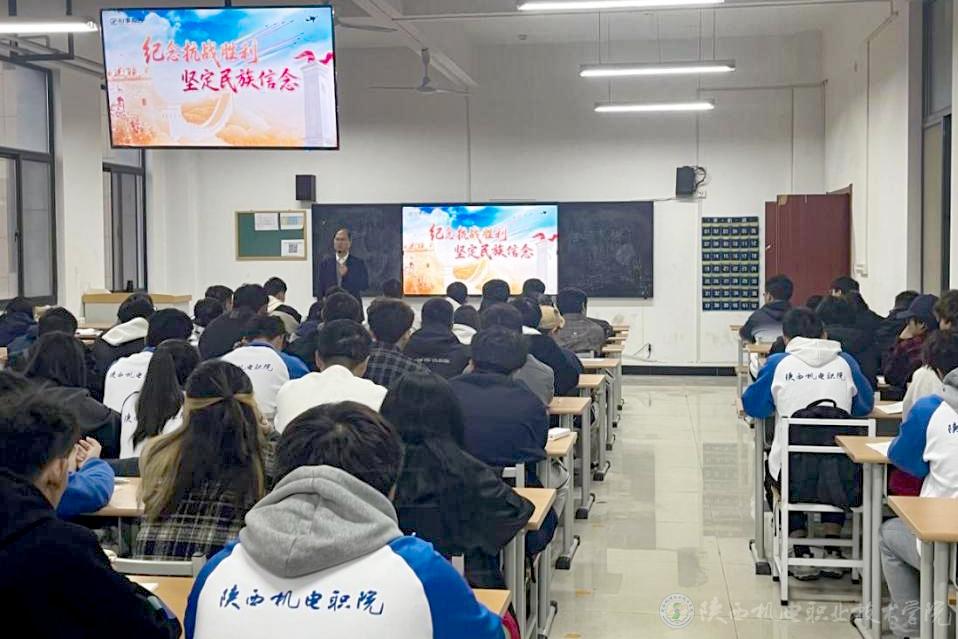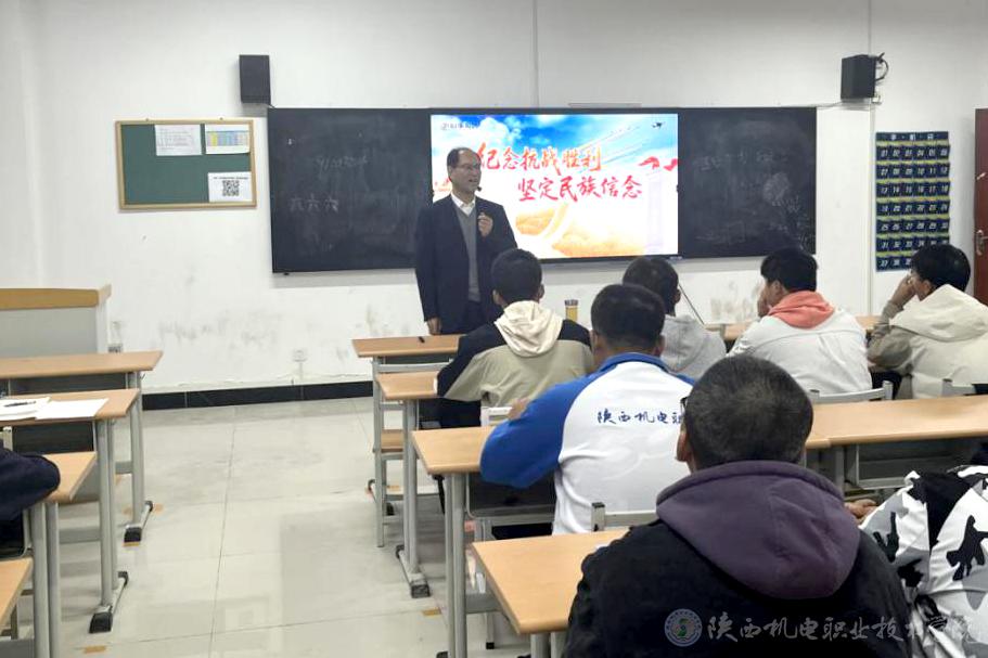 10月16日上午,陕西机电职业技术学院党委书记伊逊智在博学楼218教室为25电气技术3、25电气技术4合班学生讲授形势与政策课《纪念抗战胜利 坚定民族信念》专题内容。