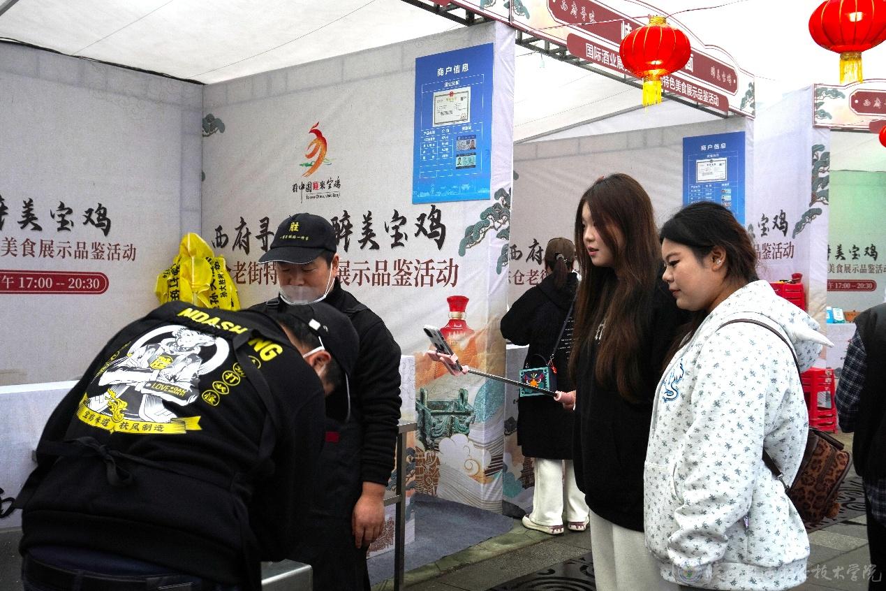 此次展会创新实施“主场馆+街区全域布展、商旅文一体联动”模式,构建“1+1+N”沉浸式展会空间,为学生提供了多元化的实践场景。展会现场,学生们分组行动,有的负责西凤酒展区的直播推广、有的聚焦非遗技艺体验区的文化展示、有的则参与“醉美宝鸡”消费体验周活动的线上宣传。学生程嘉琦说:“通过直播,我们不仅推广了产品,更讲述了宝鸡酒文化的故事。这比在教室里模拟实训更有成就感,更能锻炼我们的专业能力。