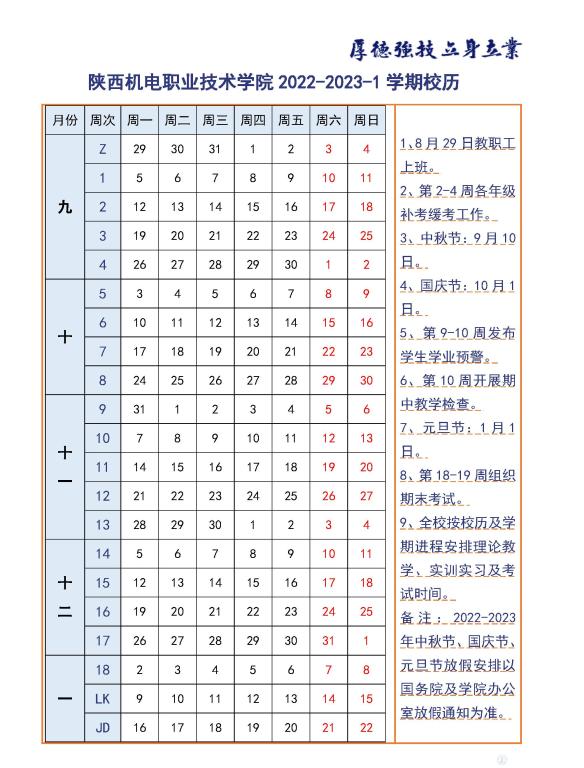 陕西机电职业技术学院2022-2023-1学期校历