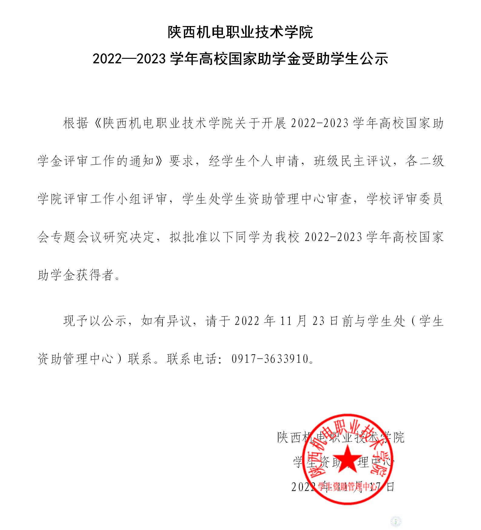 陕西机电职业技术学院 2022—2023学年高校国家助学金受助学生公示