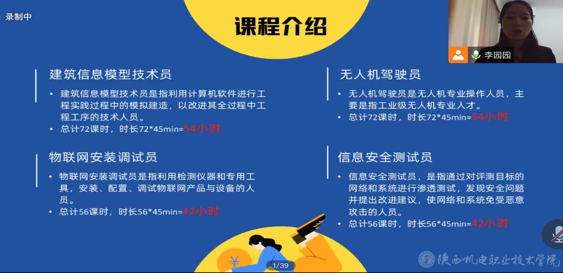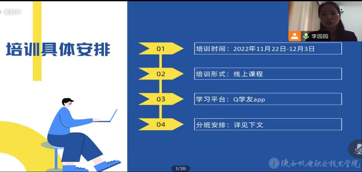 11月22日上午,“青年新职业”培训班正式开班,在开班仪式上,培训处处长何蒙辉从四个新职业的就业优势以及未来的展望做了阐述,并对参训学生提出了要求:希望学员们高度重视,珍惜本次提升技能的机会,并要学以致用,开拓就业新思路。担任本次培训项目的陕西卓越天成职业技能培训学校陈伟校长介绍了本次培训职业的具体内容、上课形式、课程时长,鼓励学员们在新经济转型期,抓住机遇开拓思路,珍惜机会,努力学习。线上会议主持由卓越天成培训学校李园园老师担任。