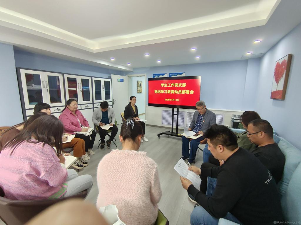 4月15日下午,学生工作党支部在蟠龙校区心理健康教育中心召开党员大会,安排部署党纪学习教育工作。支部全体党员参加,部署会由党支部书记王建斌主持。