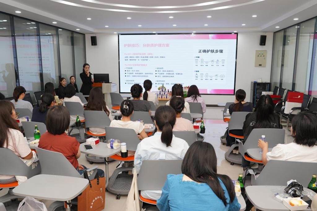 本次活动特邀宝鸡市开元商城资深美妆团队。专业讲师首先聚焦夏季肌肤科学护理,深入剖析了外源性衰老成因,并通过互动问答引导大家精准识别自身肤质,针对性地传授了分肤质精简护理方案与关键护肤流程。随后,课程重点转向高效通勤与得体职场妆容的打造,讲师现场拆解了“10分钟快速通勤妆”的核心步骤,在“模特”老师的配合下,现场演示了“完美职场妆”的进阶技巧,包括精准遮瑕、雾面底妆与立体修容的搭配法则。令在场教职工受益匪浅。每位参与者领取到了品牌护肤品及化妆品体验装作为贴心伴手礼。